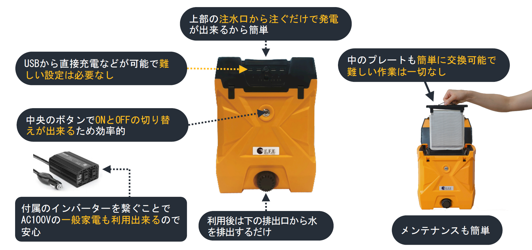 | 付属品 | 1.本体 2.ショルダーベルト 3.インバーター 4.インバーター接続ケーブル 5.漏斗 6.計量カップ 7.注入用プラスチック容器 |